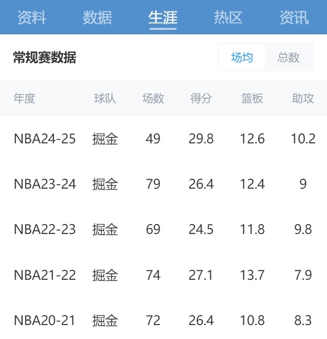能维持住吗?约基奇半程29.8+12.6+10.2 前年离场均3双仅差0.2助