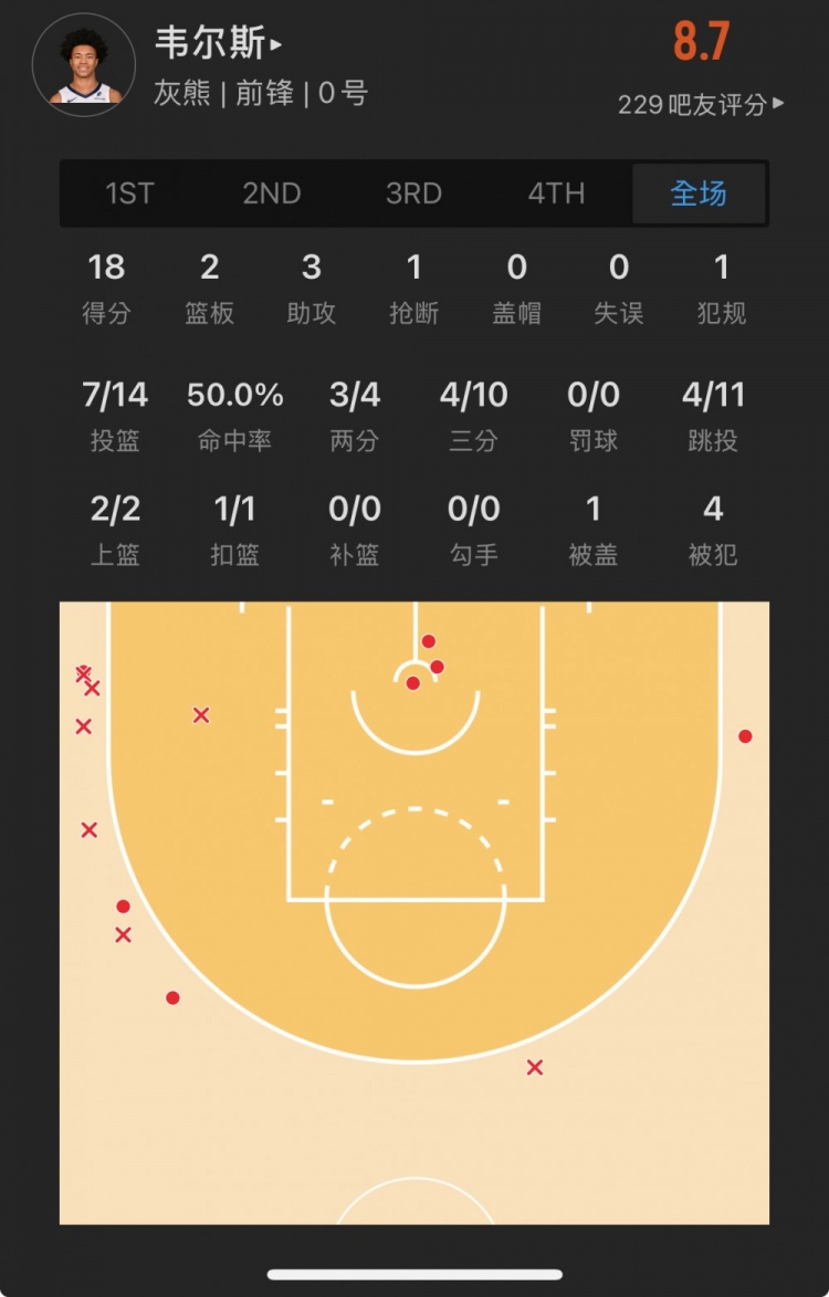 灰熊39号秀 杰伦-韦尔斯 登场38.6分钟