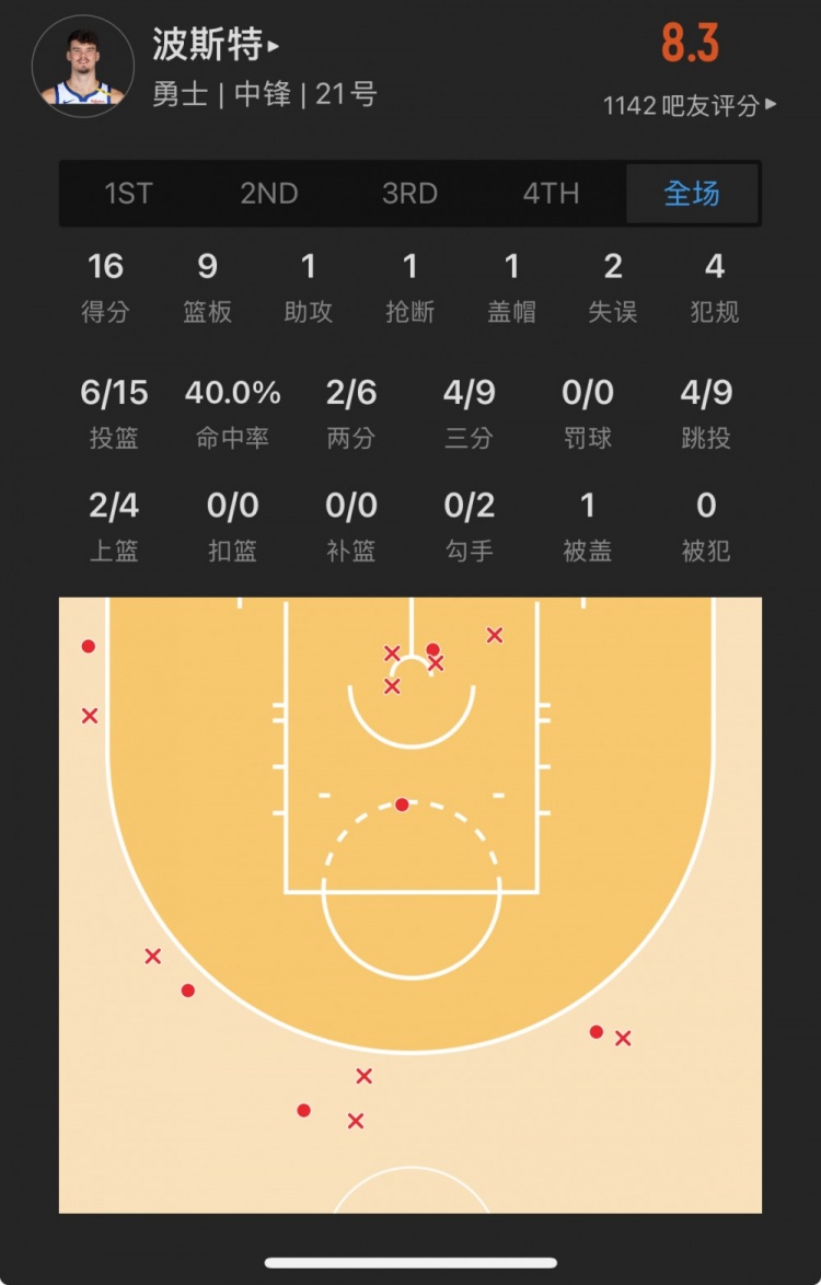 勇士52号秀 昆滕-波斯特 登场25.0分钟
