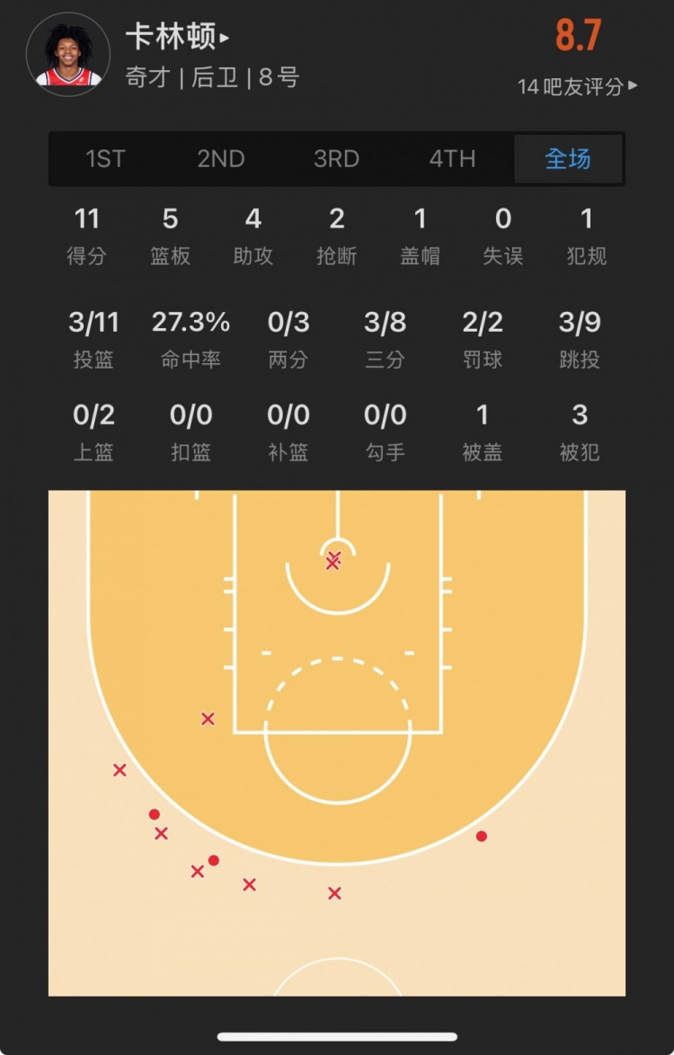 奇才14号秀 卡尔顿-卡林顿 登场31.8分钟