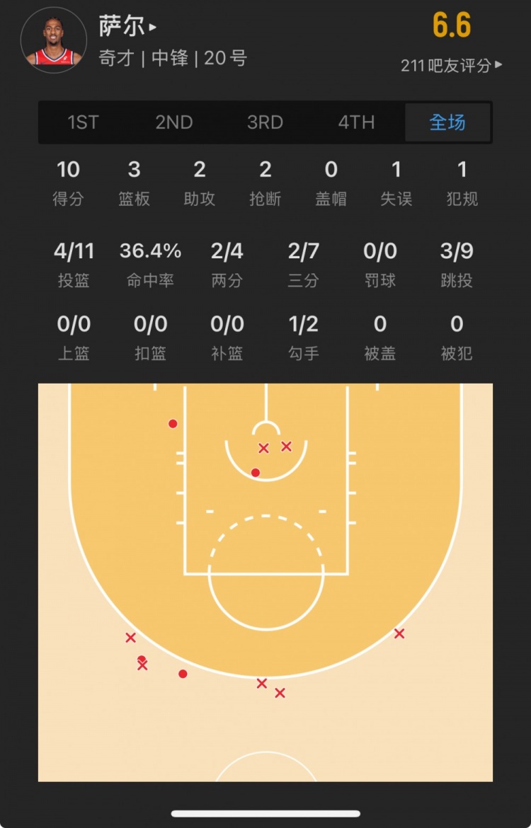 奇才榜眼秀 亚历克斯-萨尔 登场25.7分钟