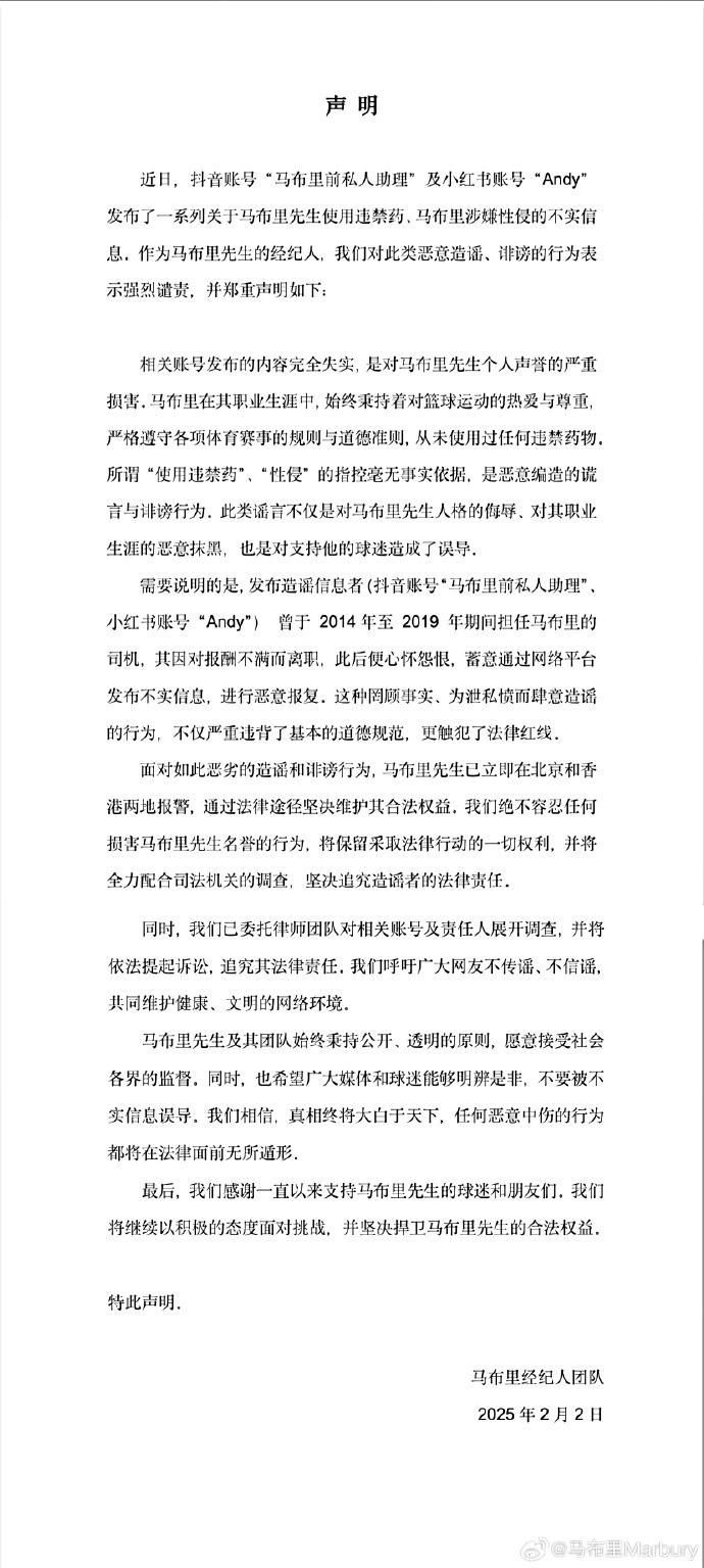 马布里随后通过个人微博发布了一篇其经纪人团队撰写的澄清信,证实了马布里已报警的说法,并对“Andy”进行了强烈谴责,原文如下:
