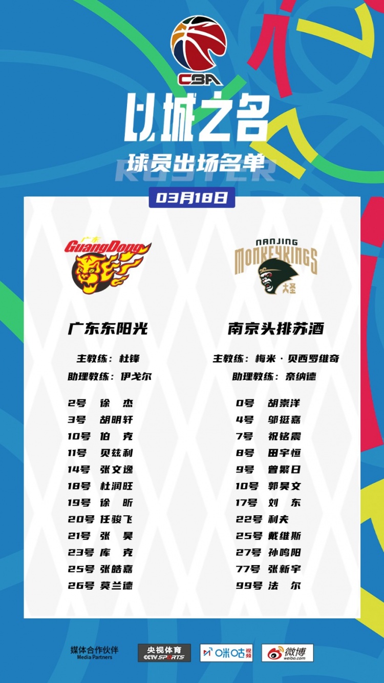 广东VS同曦大名单:徐杰胡明轩徐昕领衔 郭昊文法尔在列