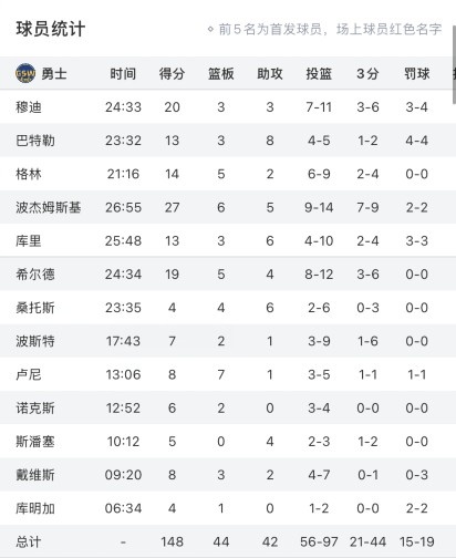本场比赛勇士早早确立大比分领先,库里、巴特勒和追梦均只出战3节,勇士出战13人全部都有得分入账。