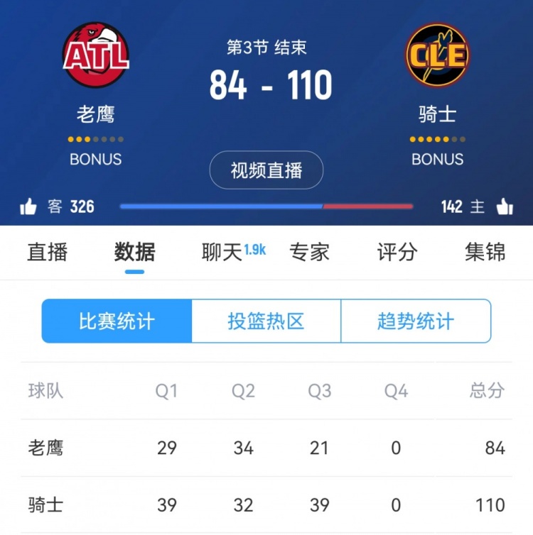 第三节,骑士攻防两端压制对手,单节39-21净胜18分,三节打完骑士获得26分的巨大优势。