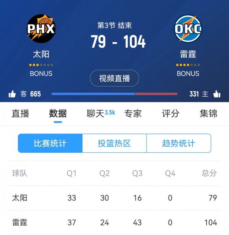 第三节,雷霆攻防两端压制对手,单节43-16净胜太阳27分,三节打完雷霆领先25分。
