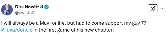 独行侠名宿诺维茨基现场观战,他发推写道:“我永远都是独行侠的一员,但我今天得来支持我的兄弟东契奇,看他开启生涯新篇章的第一场比赛!”