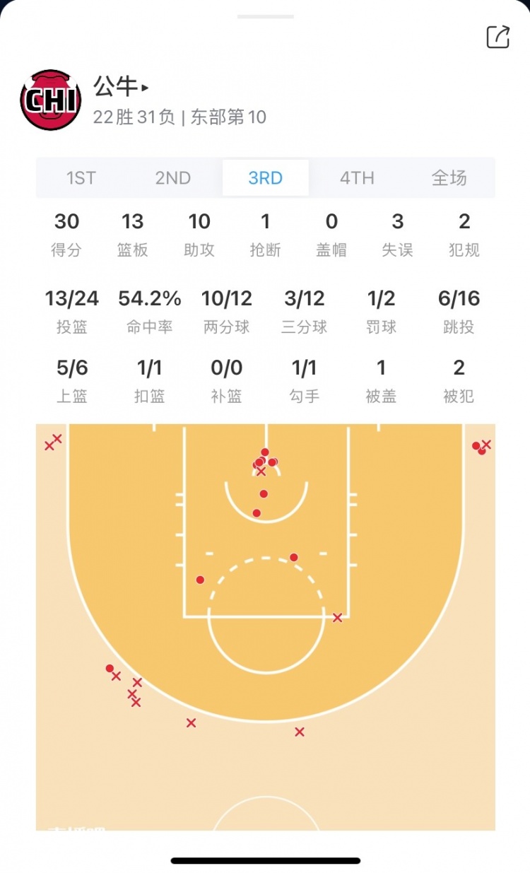 第三节,公牛进攻端终于回暖,外线三分也命中3记,内线攻筐效率很不错,单节砍下30分,超上半场两节之和(29分);布泽利斯单节4中4拿到10分。