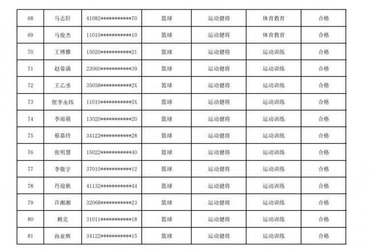 本次录取名单中篮球项目共计17人,其中有多位CBA现役球员成绩合格被录取。参加本次考核并获得合格成绩的考生仅为通过学校资格初审,最终录取名单以国家体育总局公示为准。