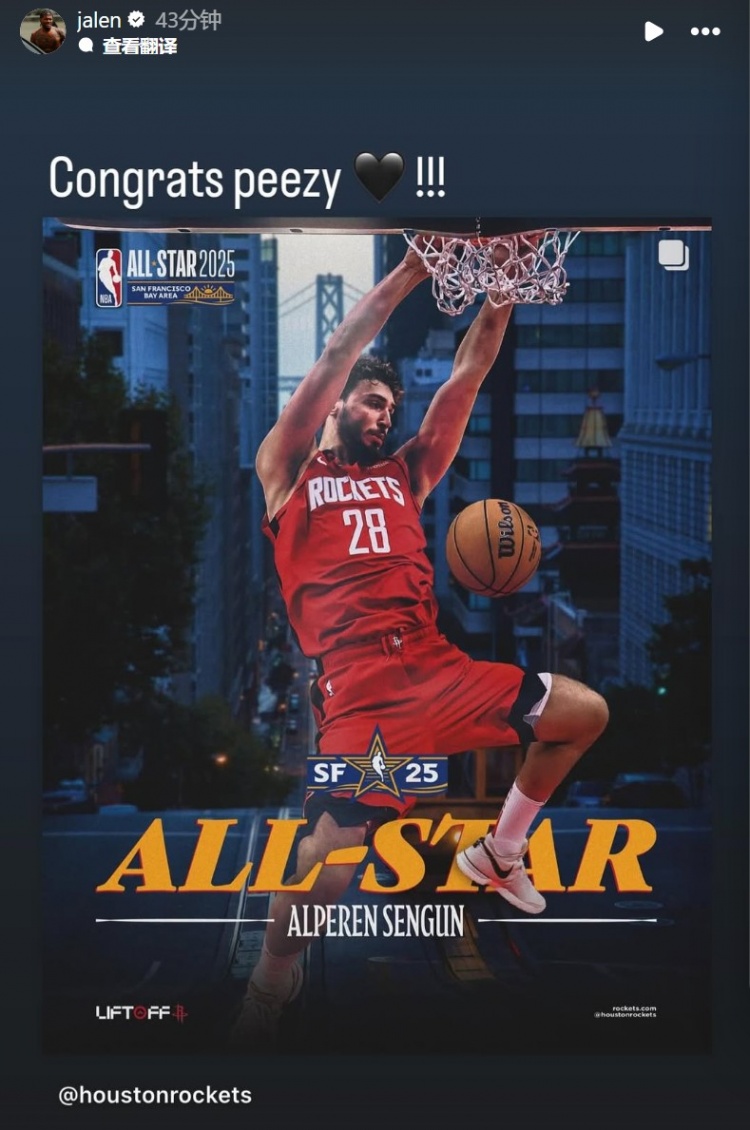 申京入选全明星!杰伦-格林、小贾巴里、范乔丹送祝福 1月31日讯 NBA官方今日公布了2025旧金山全明星的替补阵容,申京入选西部全明星替补。随后,火箭队友发来贺电。杰伦-格林在INS转发道:“恭喜!!”小贾巴里-史密斯评论道:“恭喜我的兄弟。”范弗里 2025/01/31