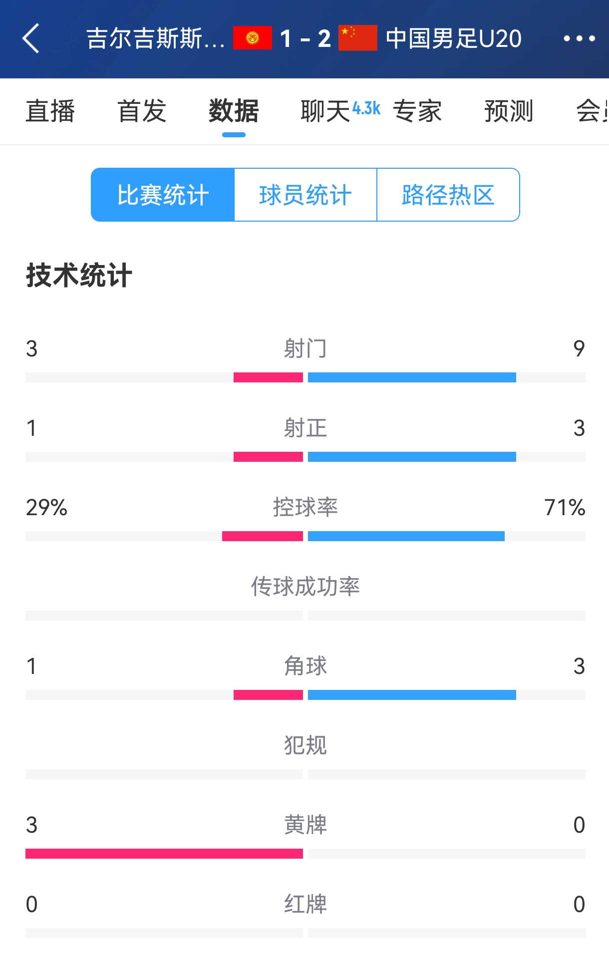 全面压制!国青半场控球率高达7成,射门比9-3,造对方3张黄牌