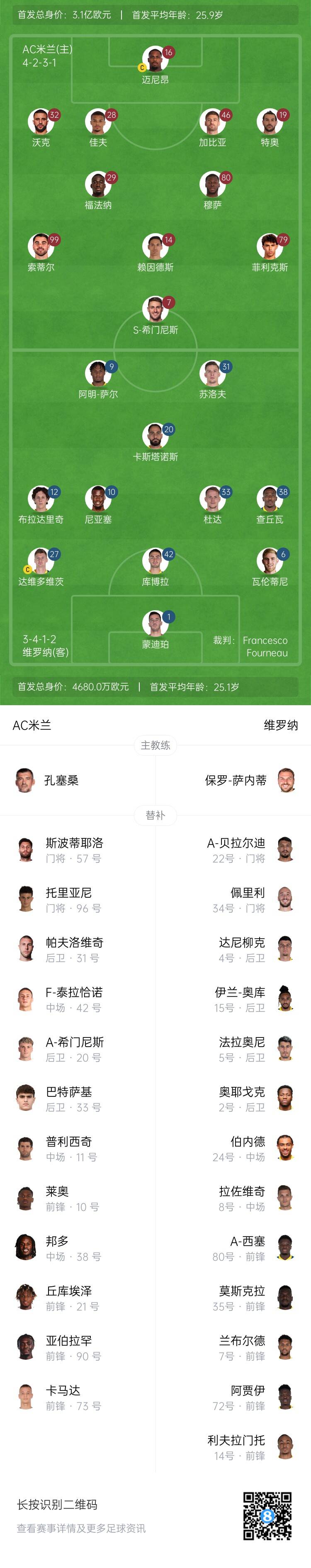 AC米兰首发:16-迈尼昂、32-沃克、28-佳夫、46-加比亚、19-特奥、80-穆萨、29-尤素夫-福法纳、14-赖因德斯、99-索蒂尔、79-菲利克斯、7-圣地亚哥-希门尼斯