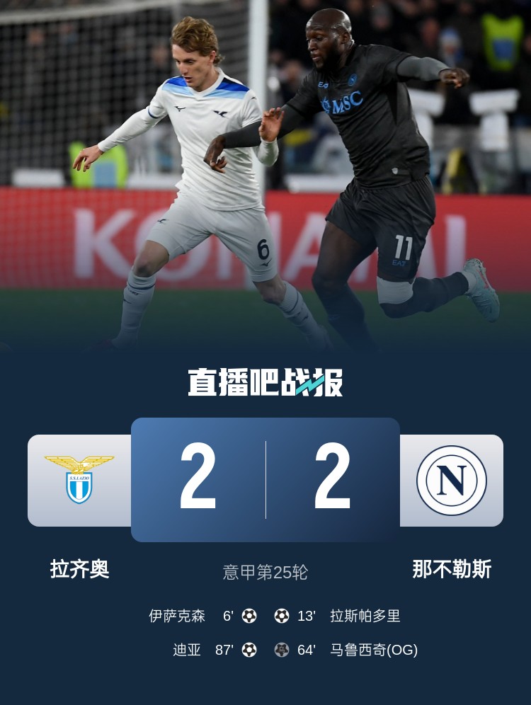 遭绝平!那不勒斯2-2拉齐奥意甲遭遇3连平 多赛1场领先国米2分