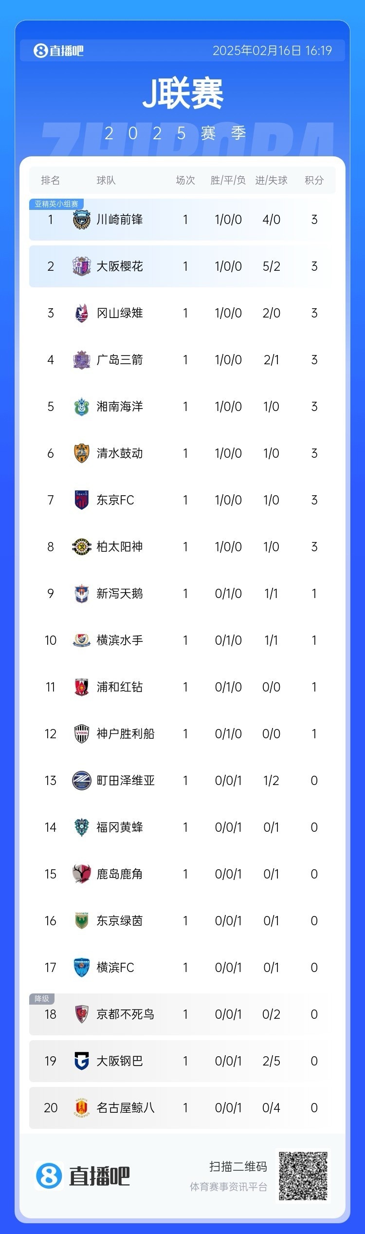 2月16日讯 新赛季J1联赛于本周末拉开帷幕,本赛季是J1联赛改为跨年赛制前最后一个赛季。首轮揭幕战便上演“大阪德比”,最终香川真司效力的大阪樱花5-2大胜上赛季殿军大阪钢巴,香川真司也收获赛季首球。其他比赛,卫冕冠军神户胜利船主场0-0闷平浦和红钻,川崎前锋4-0大胜名古屋鲸八,横滨水手1-1战平新泻天鹅,町田泽维亚主场1-2不敌广岛三箭。