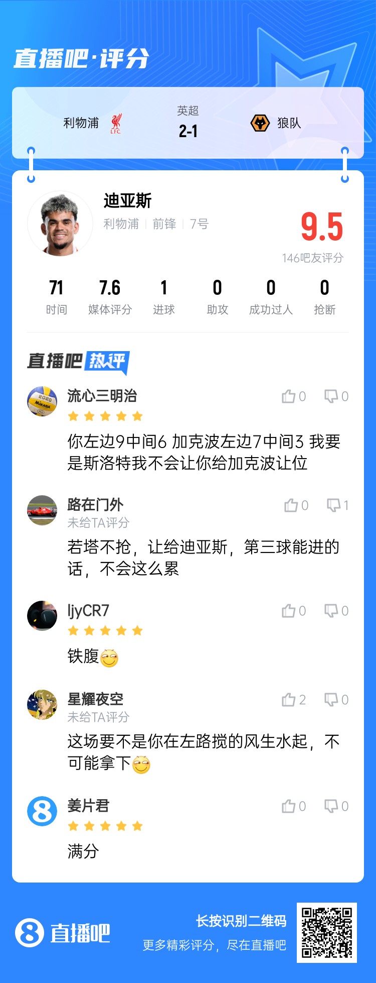 02月16日讯 英超第25轮,利物浦主场2-1战胜狼队。本场比赛迪亚斯回归左边路,首发出战71分钟,又贡献一场精彩表演,打入1球并造点。