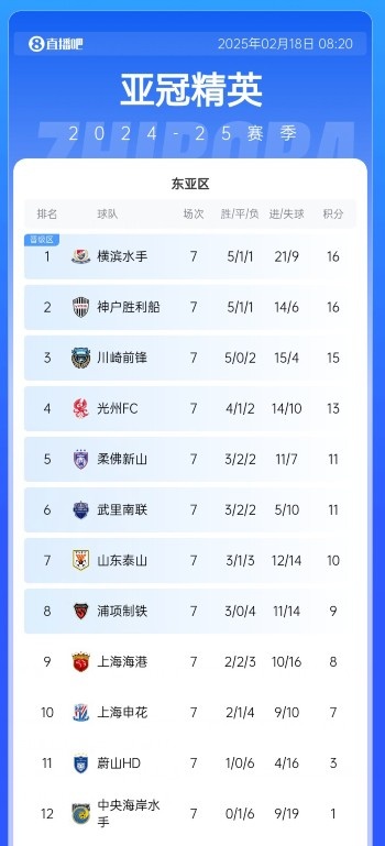 目前在积分榜上,上海申花队2胜1平4负暂列亚冠精英联赛东亚区第10位。