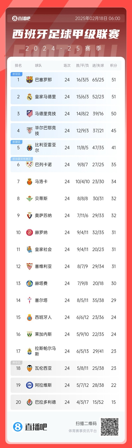 24轮联赛后西甲榜首仅积51分,是近18年来同期最低纪录