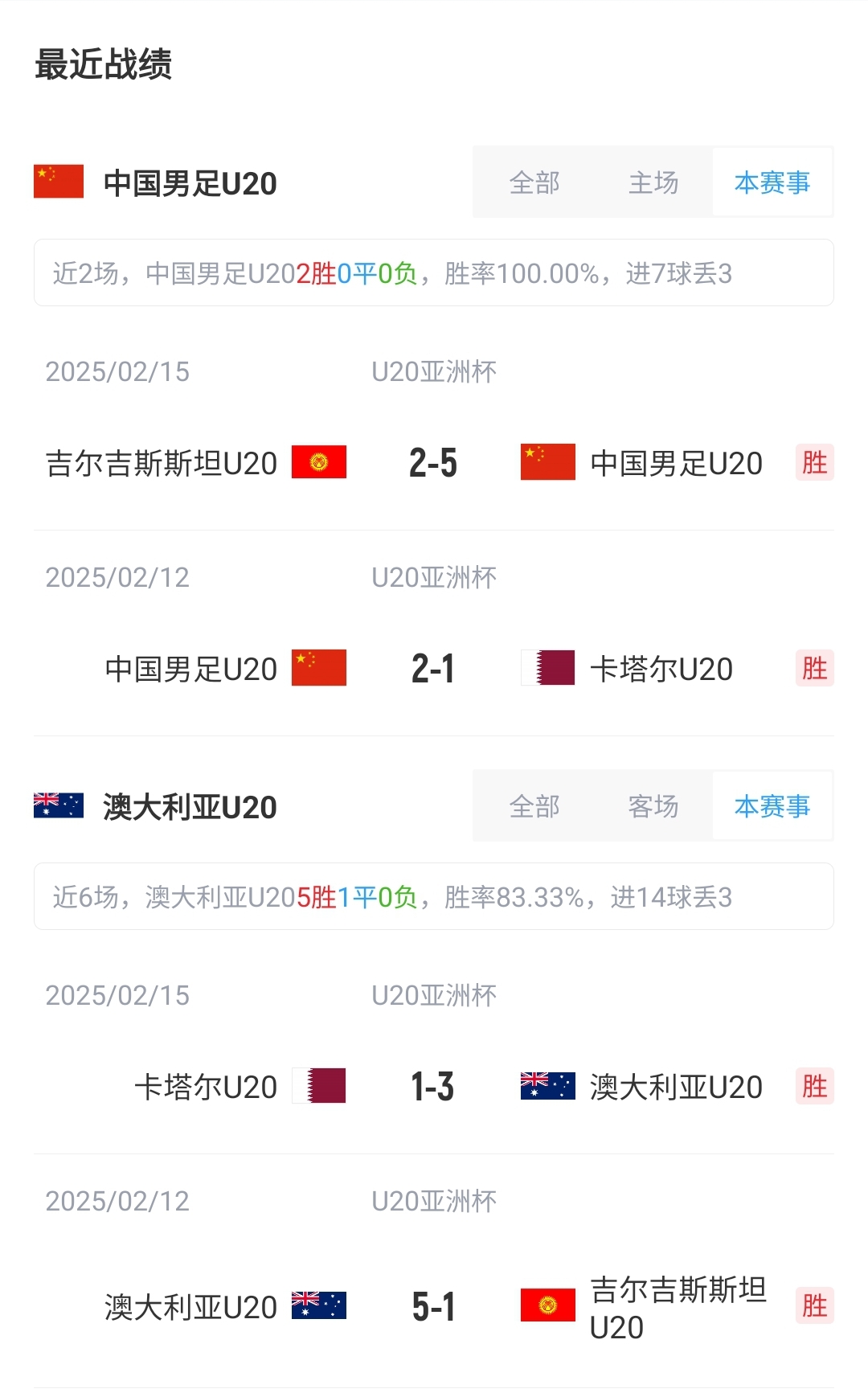 目前中国男足U20和澳大利亚U20均取得两连胜,提前晋级八强,淘汰赛的对手将是B组的前两名(A1vsB2,A2vsB1)。