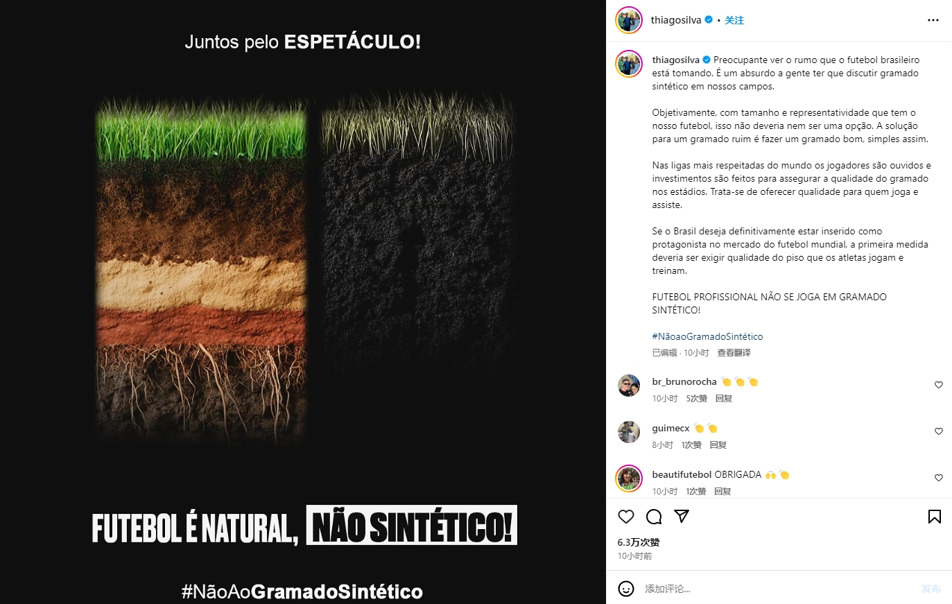 02月19日讯 内马尔、库蒂尼奥、蒂亚戈-席尔瓦等人社媒发布相同的长文,对巴西足球球场使用人工草皮进行批评。