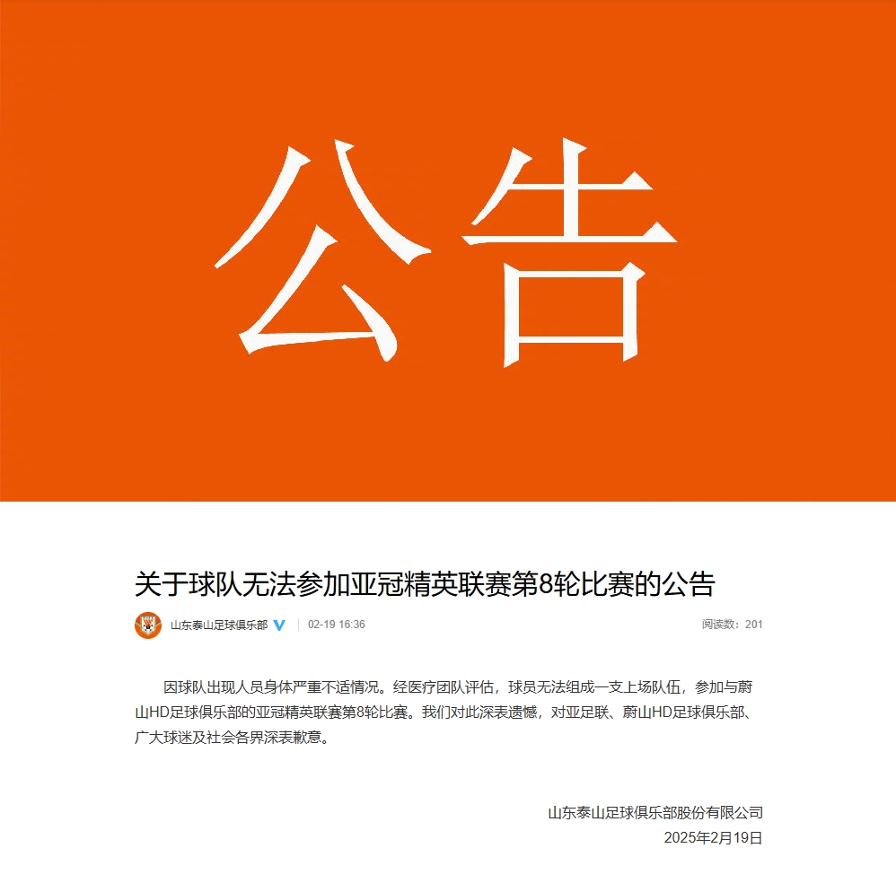 02月19日讯 山东泰山官方就退出今晚的亚冠比赛发布声明。