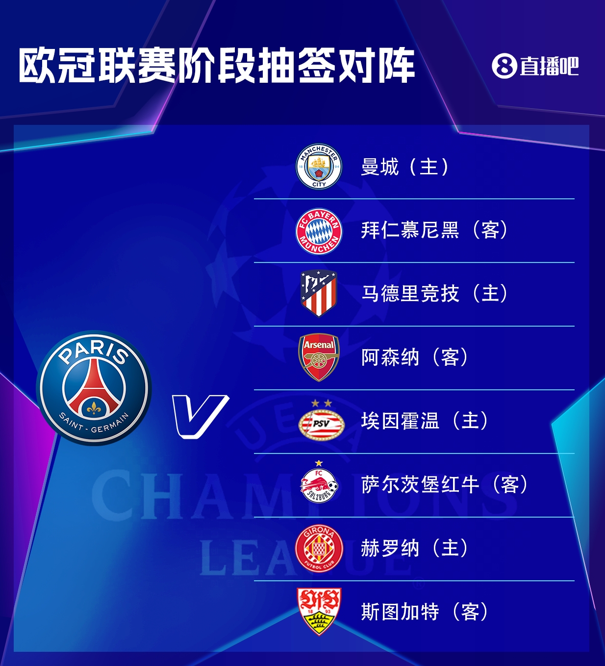 欧冠联赛阶段中,巴黎则是抽到了曼城、拜仁、马竞、阿森纳、埃因霍温、萨尔茨堡红牛、赫罗纳、斯图加特。