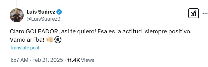 苏亚雷斯表示道:“你当然还是进球的射手,我很爱你!你要永远保持积极向上的态度,继续加油吧!????????⚽️”