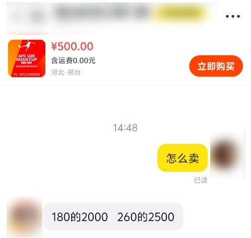 本场比赛门票开票后,1分钟就售罄,销售异常火爆!目前,有黄牛已经将原价180元的门票炒至1000-2000元,其他价位的门票价格更高。