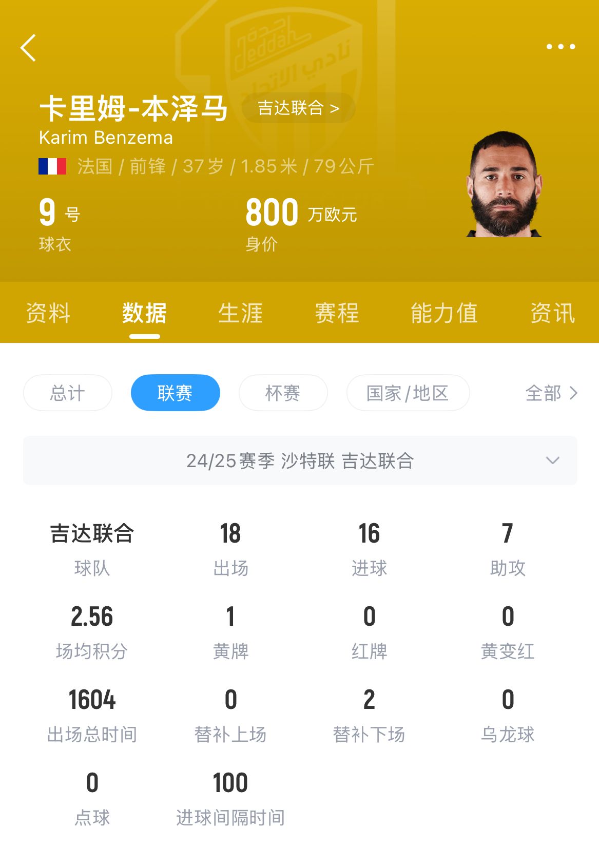 本场过后,本泽马以18场16球的联赛数据,登上沙特联射手榜头名的位置,他与C罗均打入16球。