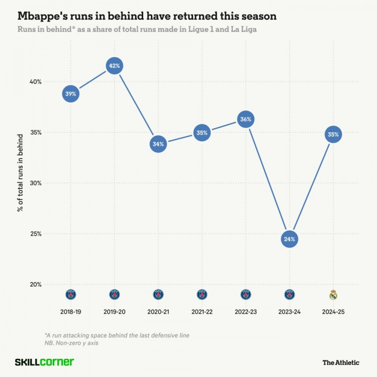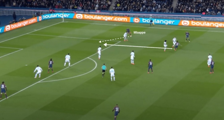 姆巴佩本赛季又开始频繁地进行身后跑位了