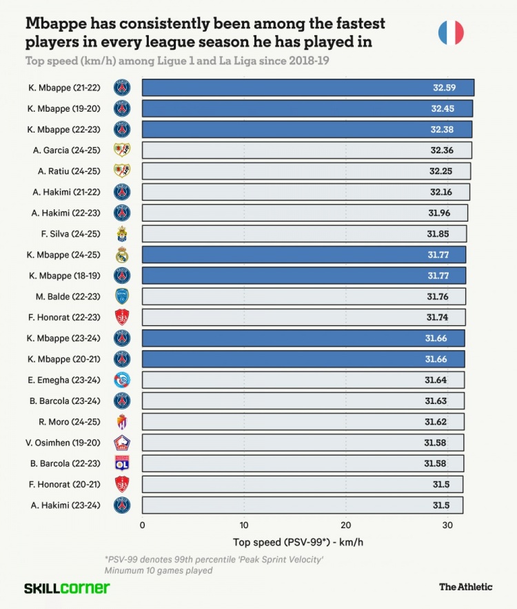 自2018/2019赛季以来,法甲和西甲联赛中速度最快球员统计