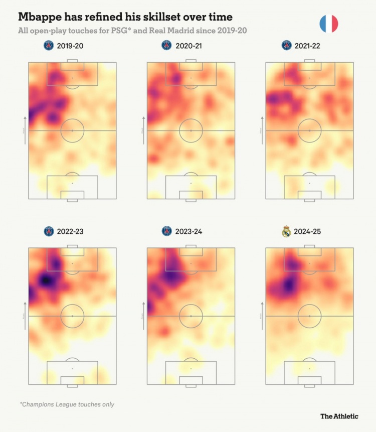 本赛季,姆巴佩更多地进入禁区进行跑位
