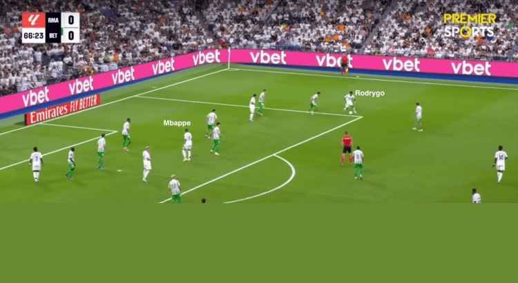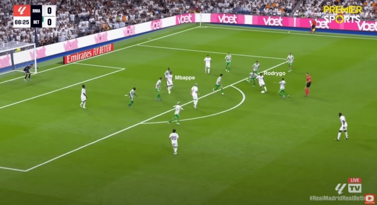 当罗德里戈从右路带球内切之时,姆巴佩背对着球门,以便更好地创造进攻空间……