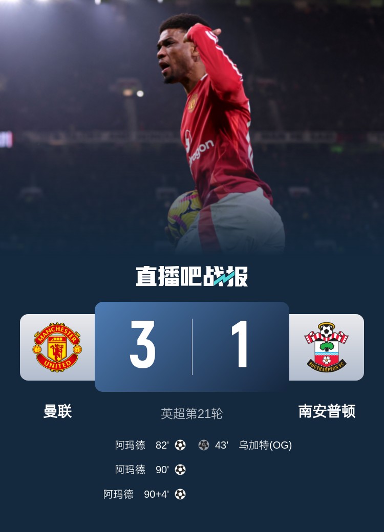 英超第21轮,南安普顿一直到81分钟还保持1-0领先,随后阿玛德连进三球逆转比赛。