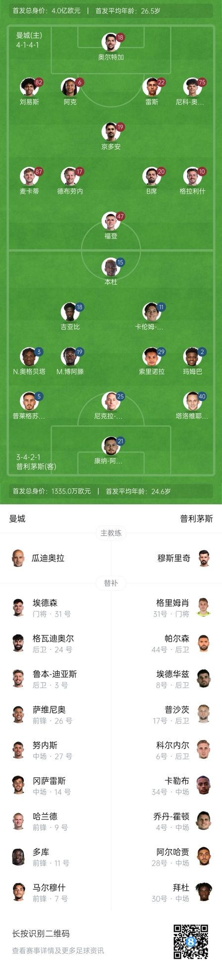 曼城首发:18-奥尔特加、82-刘易斯、22-雷斯、6-阿克、75-奥赖利、19-京多安、17-德布劳内、87-麦卡蒂、20-B-席尔瓦、10-格拉利什、47-福登
