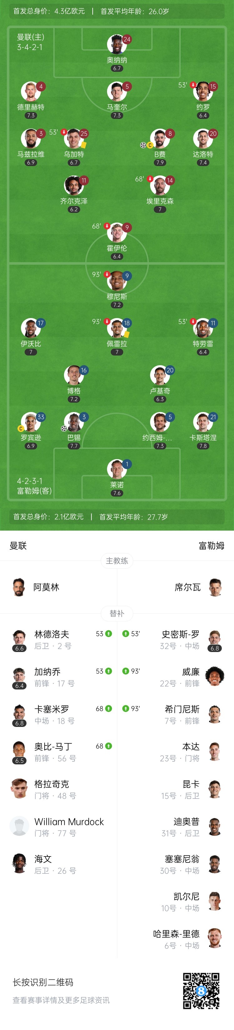 上半场伤停补时1分钟,半场战罢,曼联暂0-1富勒姆。
