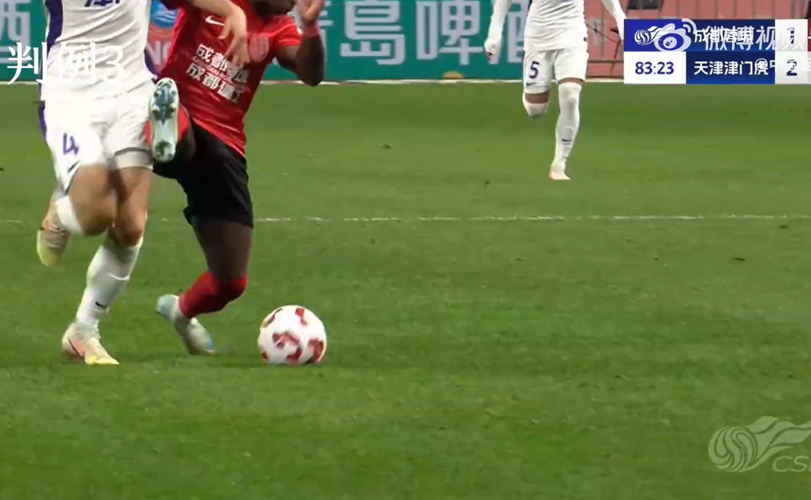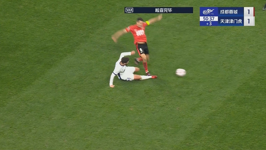 【判例三】:中超联赛第2轮,成都蓉城VS天津津门虎,比赛第84分钟,天津津门虎4号队员在争抢球时疑似踩踏成都蓉城47号队员,裁判员判罚天津津门虎4号犯规,未出示红黄牌,VAR未介入。