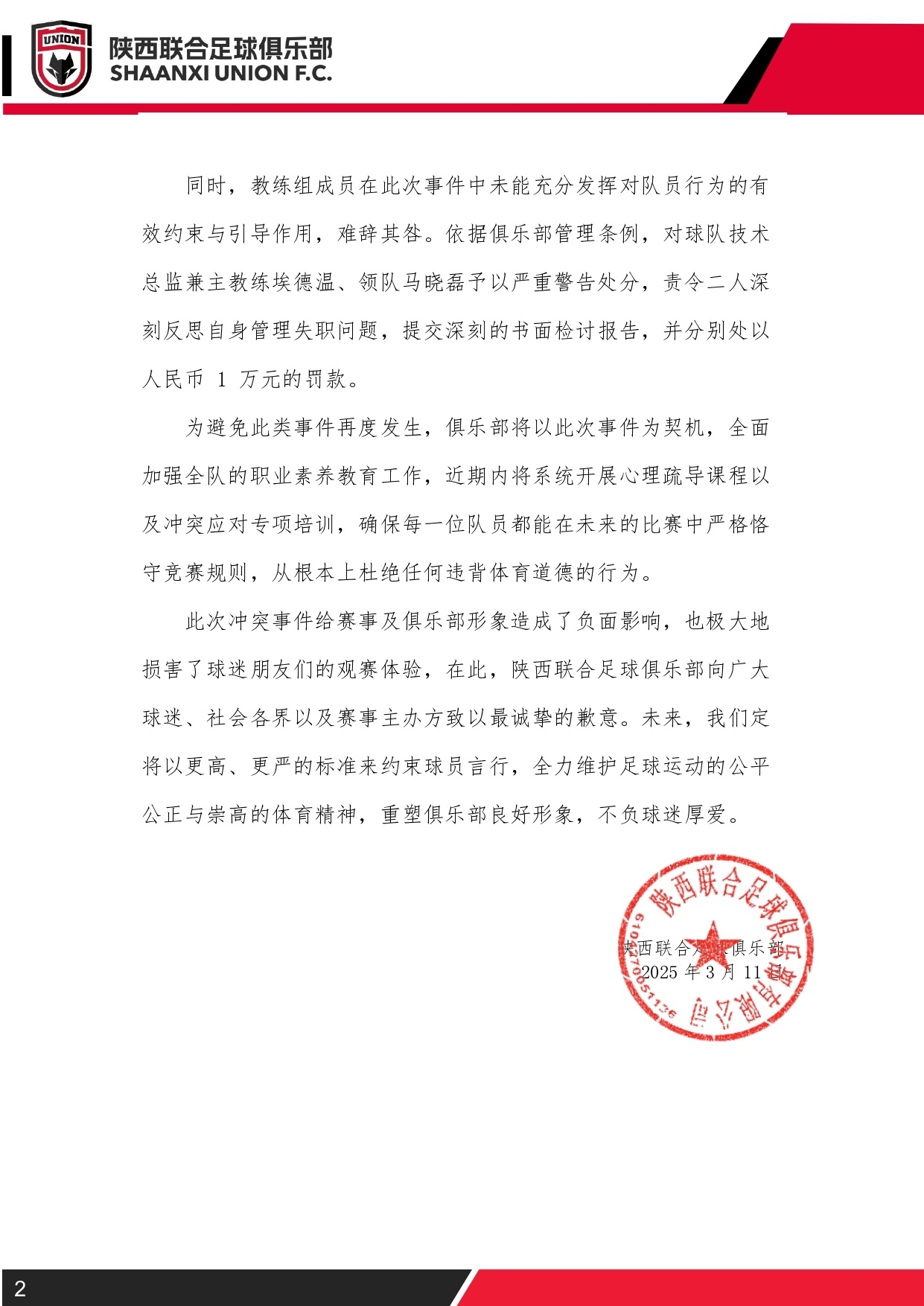 此次冲突事件给赛事及俱乐部形象造成了负面影响,也极大地损害了球迷朋友们的观赛体验,在此,陕西联合足球俱乐部向广大球迷、社会各界以及赛事主办方致以最诚挚的歉意。未来,我们定将以更高、更严的标准来约束球员言行,全力维护足球运动的公平公正与崇高的体育精神,重塑俱乐部良好形象,不负球迷厚爱。