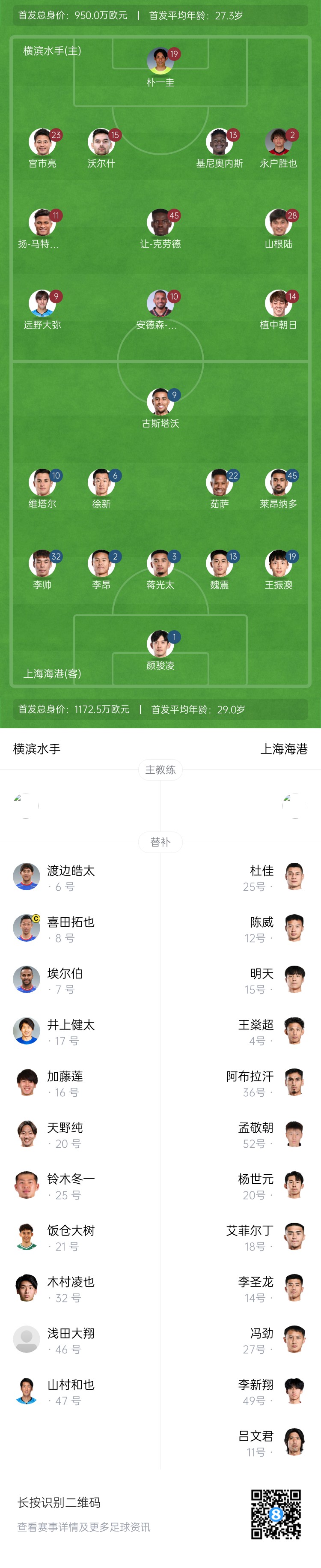 03月11日讯 北京时间18点,亚冠精英联赛东亚区1/8决赛次回合,上海海港客场挑战横滨水手,赛前官方公布两队首发阵容。