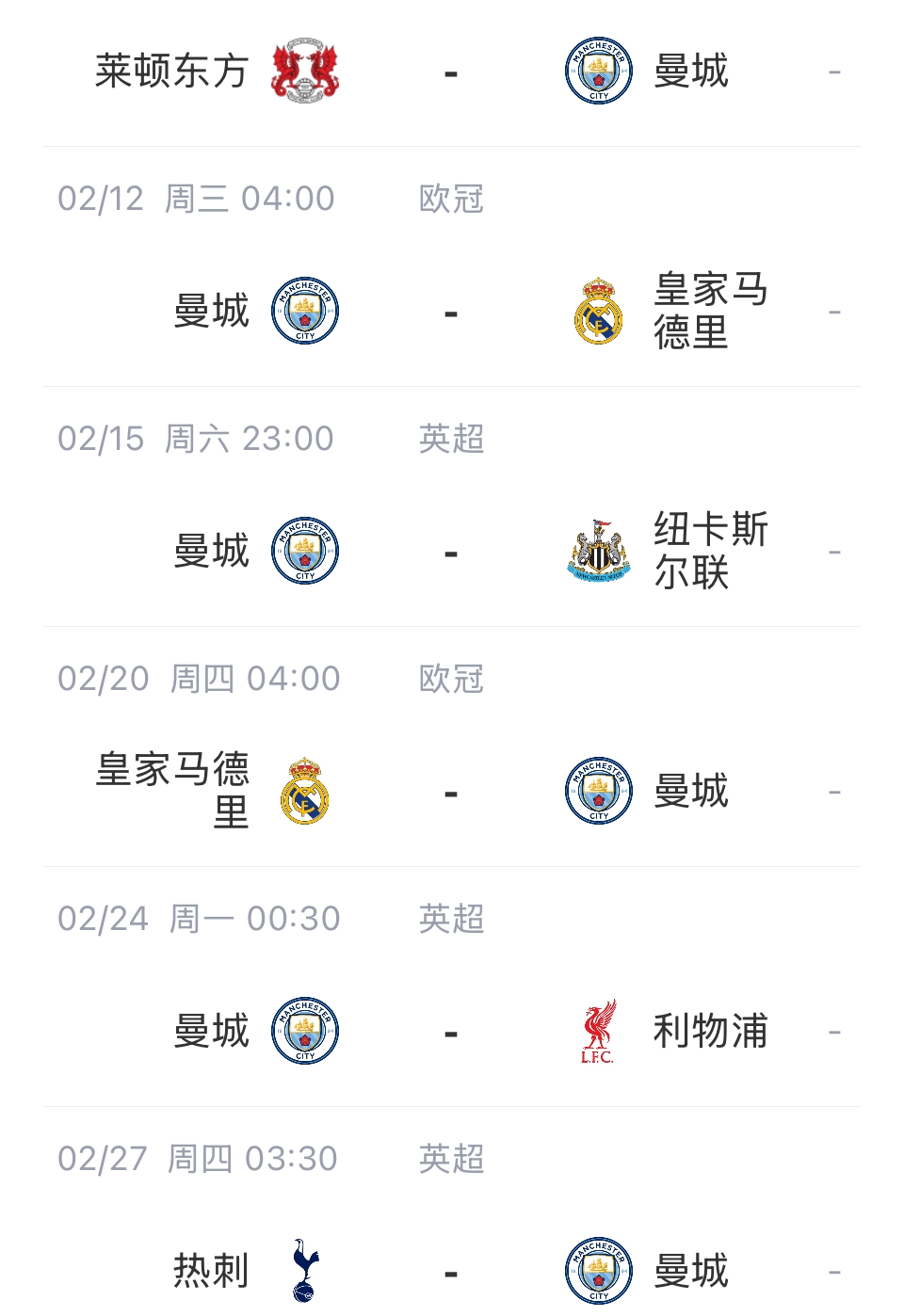 下一场客战莱顿东方之后,曼城需要先主后客对阵皇马,在英超赛场还需要对阵纽卡、利物浦、热刺。