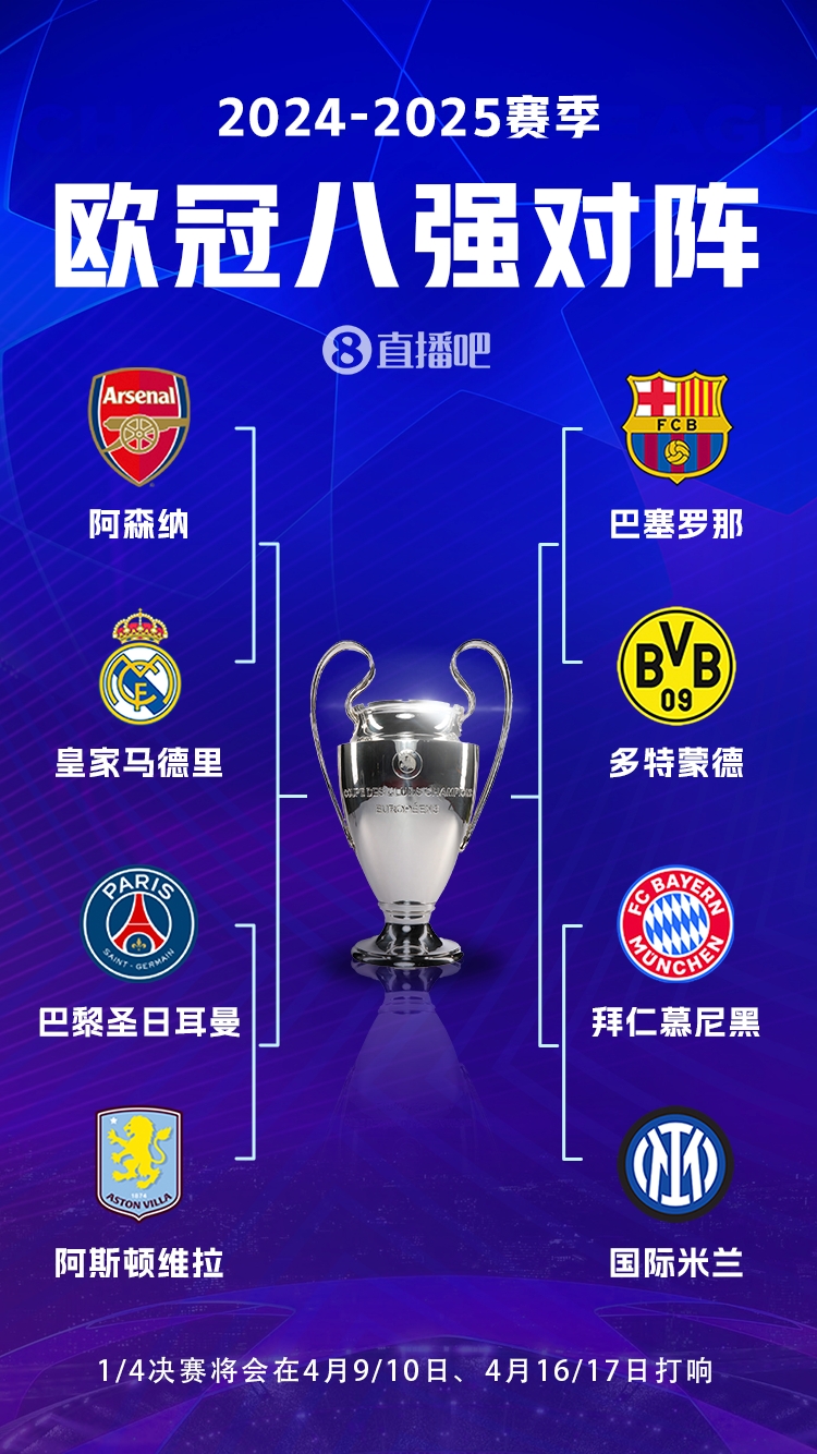 欧冠8强:拜仁、国米、巴萨、多特、巴黎、维拉、阿森纳、皇马