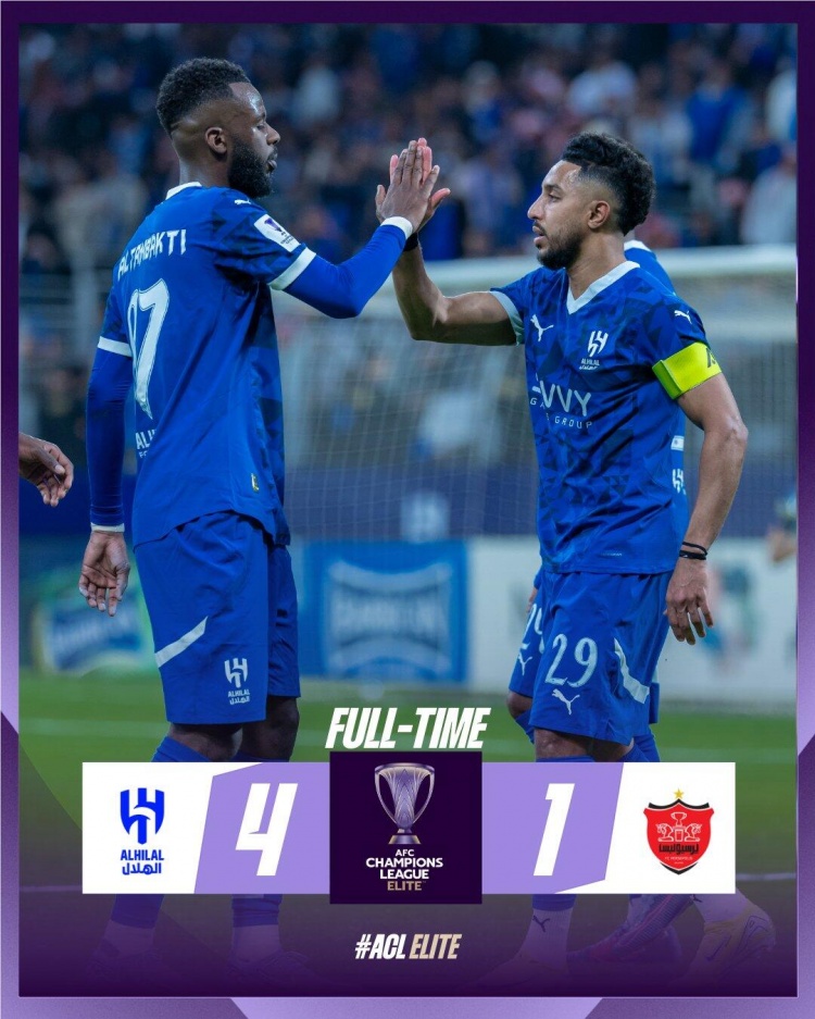 亚冠精英联赛西亚区第7轮,利雅得新月4-1击败波斯波利斯。上半场,马尔科姆超级一条龙破门,坎塞洛扩大优势,多萨里连进两球。下半场,布莱希送点,格维勒西亚尼点射扳回一球。