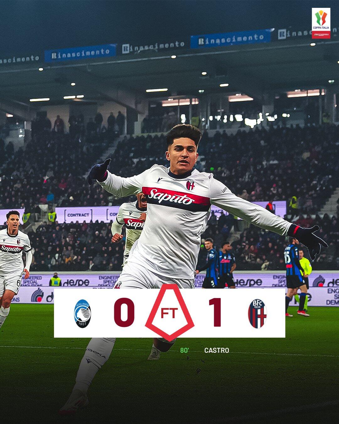 意大利杯1/4决赛,博洛尼亚1-0击败亚特兰大晋级四强。上半场,双方均无建树;下半场,直到第80分钟,替补登场的卡斯特罗一击制胜。