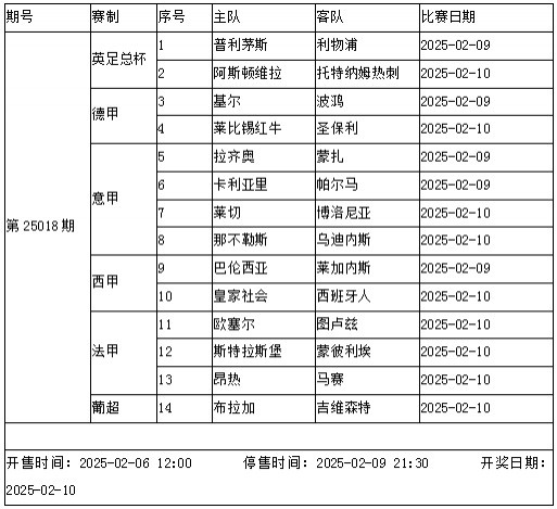 传足胜负彩第25018期竞猜赛事重点关注豪门球队:英足总杯赛事中利物浦和热刺将分别对阵普利茅斯和维拉,意甲领头羊那不勒斯在主场面对乌迪内斯,拉齐奥主场迎战蒙扎。