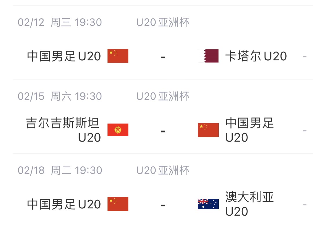 2月12日 19:30 中国队vs卡塔尔队(揭幕战),深圳市青少年足球训练基地体育场