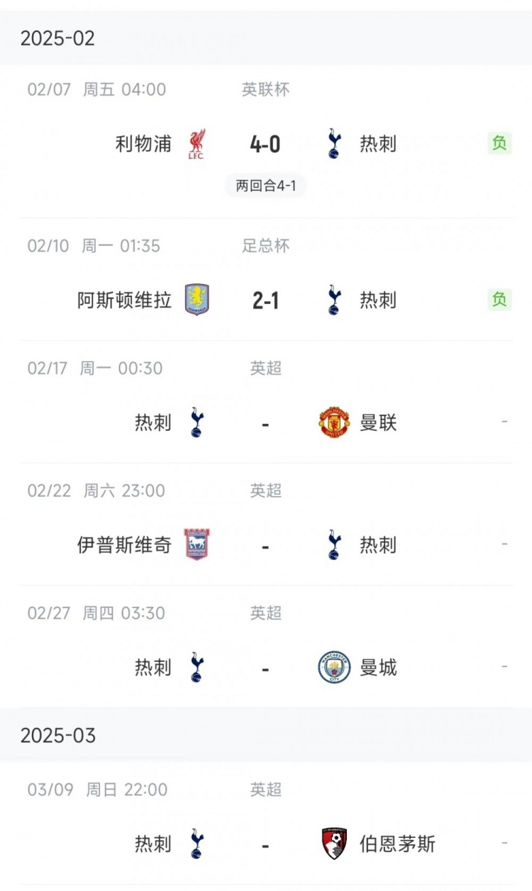联赛方面,热刺目前8胜3平13负积27分,排在第14位。接下来4轮比赛,热刺将对阵曼联、伊普斯维奇、曼城、伯恩茅斯。
