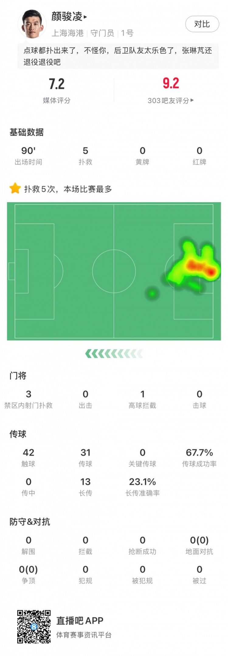 尽力局!颜骏凌扑点&全场5次扑救,赛后评分7.2队内最高