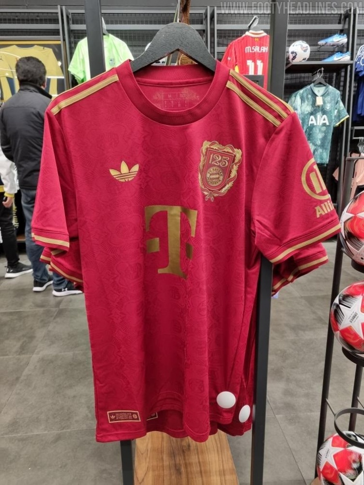 从不久前曝光的拜仁纪念球衣照片可以看出,这款球衣采用了深红色主色调和金色镶边装饰,经典三叶草LOGO、印有125字样并以月桂花环装饰的拜仁盾式队徽分列胸前。