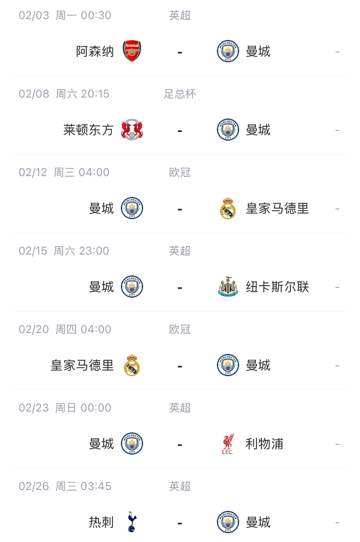 曼城2月首战将客战阿森纳,对阵皇马的两场欧冠附加赛分别在2月12日和20日进行,中间15号需对阵纽卡,踢完皇马的3天之后将对阵目前的英超榜首利物浦。