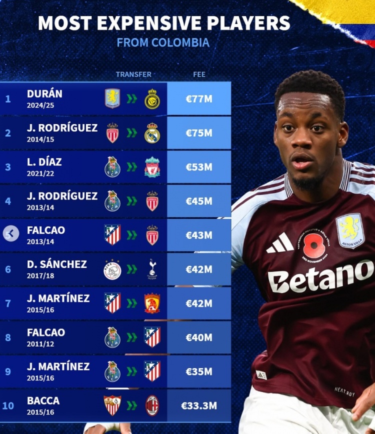 2月1日讯 利雅得胜利已经官宣7700万欧基础转会费签下维拉前锋杜兰,数据统计显示这也打破了哥伦比亚籍球员的历史转会费纪录。
