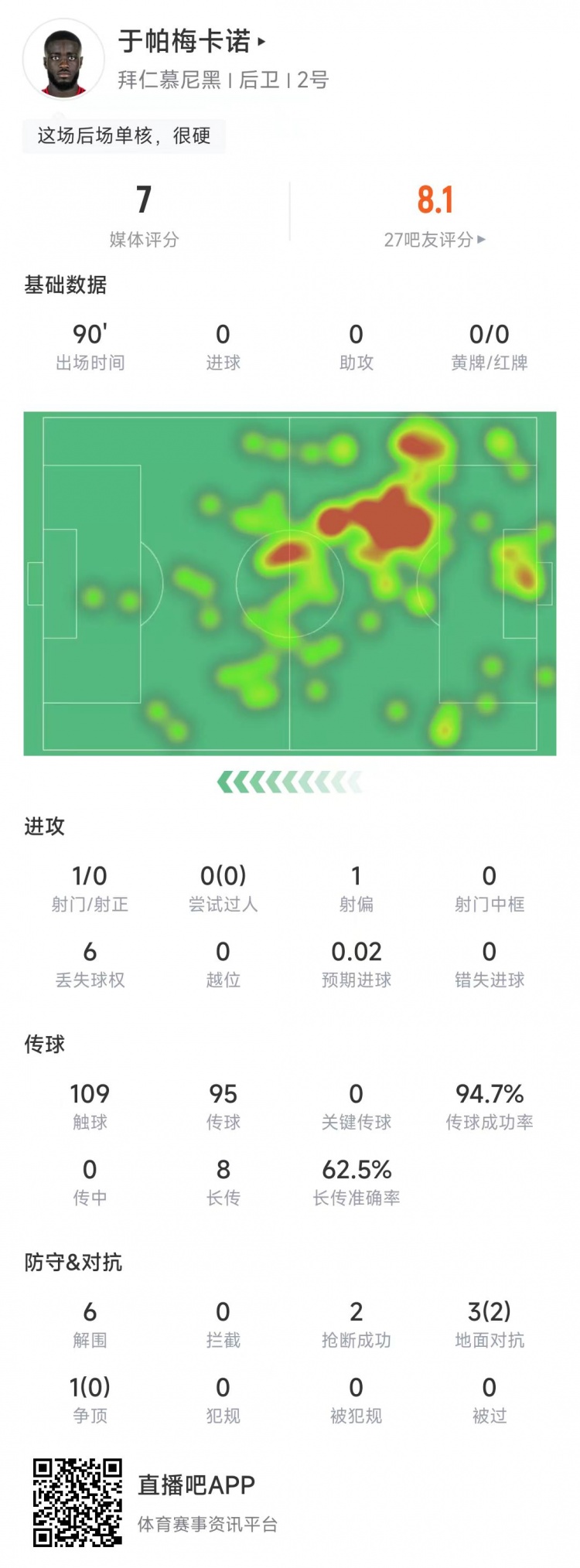 6次解围+2次抢断!于帕梅卡诺当选拜仁vs凯尔特人全场最佳球员